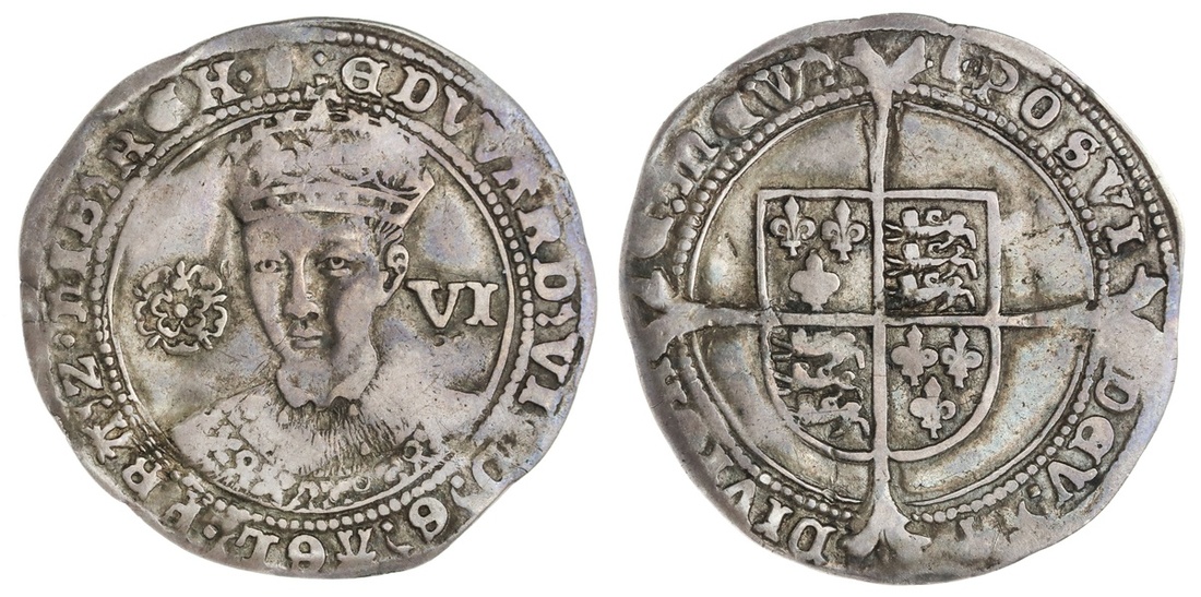 England. House of Tudor. Edward VI (1547-1553). Third period, 1550-1553. Sixpence, mm tun. 2.86 gms. Crowned bust facing ¾ left, rose left, value VI at right, rev. Shield over cross fourchee. S.2483. Good portrait. Toned. Very Fine.