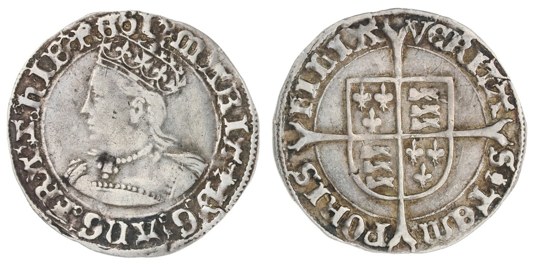 England. House of Tudor. Mary (1553-1554). Groat, mm pomegranate. 2.06 gms. Crowned bust left, rev. Shield over cross fourchee. S.2492. Very Fine.