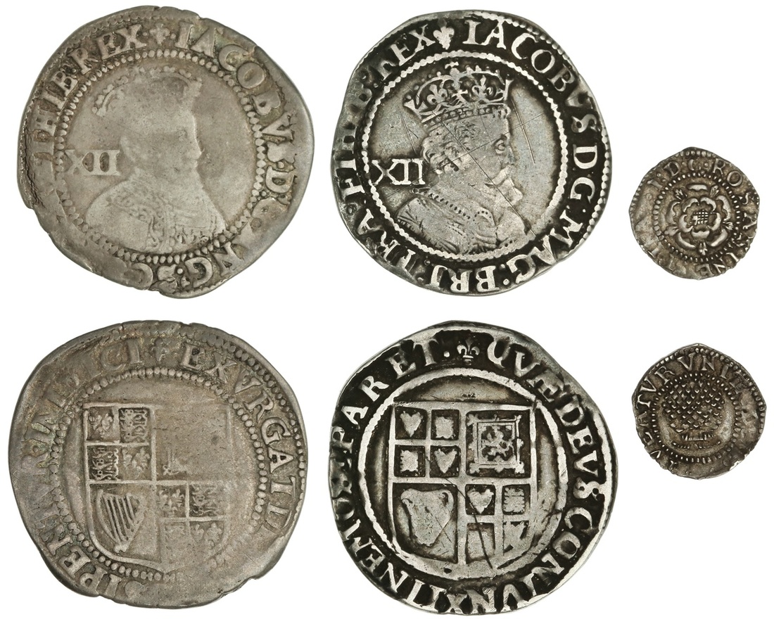 England. House of Stuart. James I (1603-1625). Trio: First coinage, 1603-4. Shilling, mm lis. Crowned bust right. S.2646. Weak centers, About Fine; Third coinage, 1619-25. Shilling, mm lis, 1623-4. Sixth bust right. S.2668. Toned over obverse test scratches. VF; Penny. S.2672. Rose, thistle. Extremely Fine. (3)