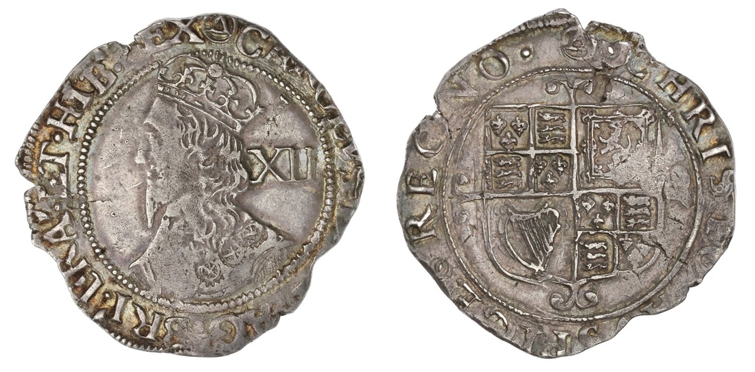 England. House of Stuart. Charles I (1625-1649). Shilling, mm triangle in circle, 1641-3. Tower mint under the King. 6.11 gms. Sixth large "Briot's" bust left, XII, rev. Square-topped shield over cross Moline. S.2799. Some typical weakness at obverse center. Irregular edge. About Extremely Fine.