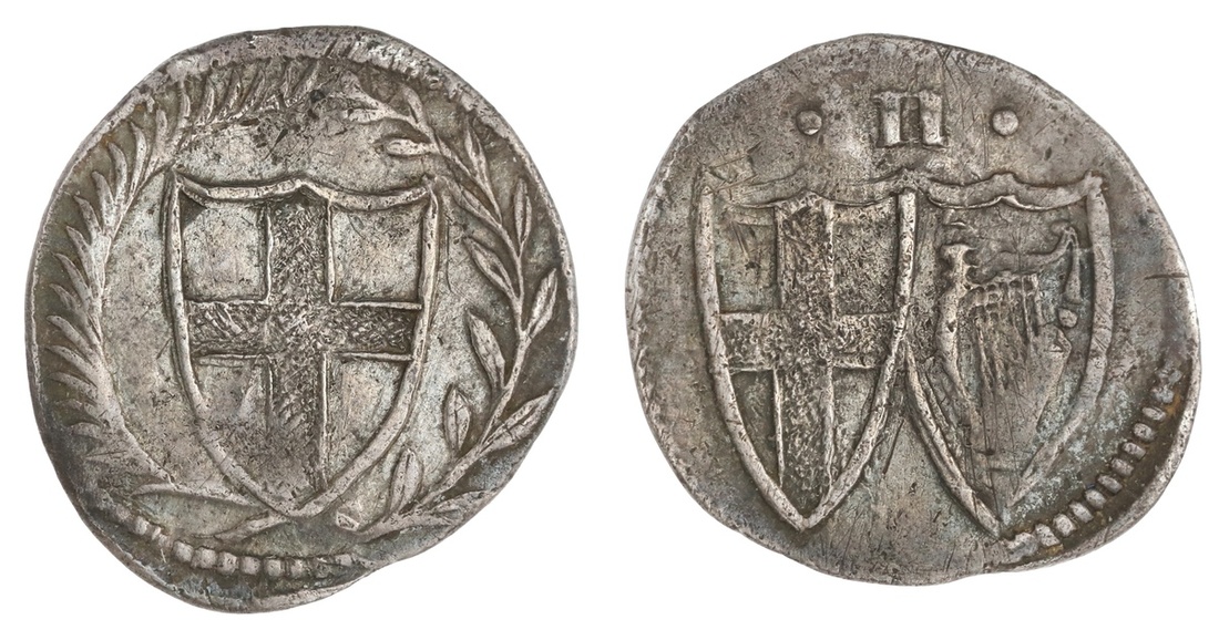 England. Commonwealth (1649-1660). Halfgroat. 0.83 gms. Shield with St. George's cross within wreath, rev. Shields bearing St. George's cross and Irish harp, joined, value above. S.3221. Toned. Very Fine.