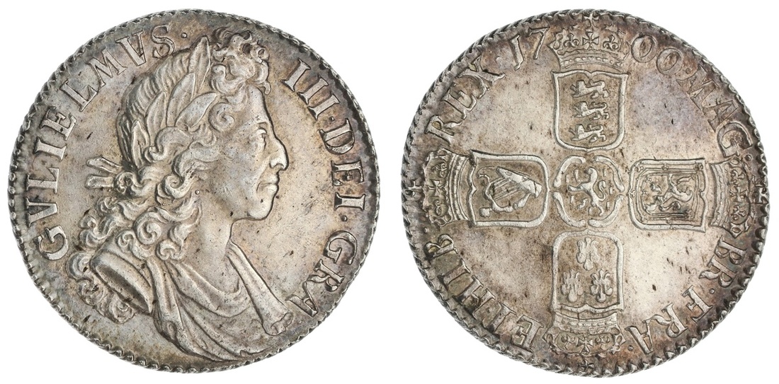 England. William III (1694-1702). Shilling, 1700. Fifth draped bust right, rev. Crowned cruciform Arms, Lion of Orange at center. S.3516, KM 504.1. Toned. Choice About Uncirculated.