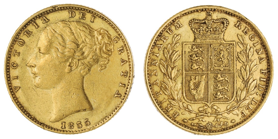 Great Britain. Victoria (1837-1901). Sovereign, 1855. Young head left, W.W. incuse, rev. Crowned Arms within wreath. S.3852D, KM 736.1. Light contact marks. About Extremely Fine.