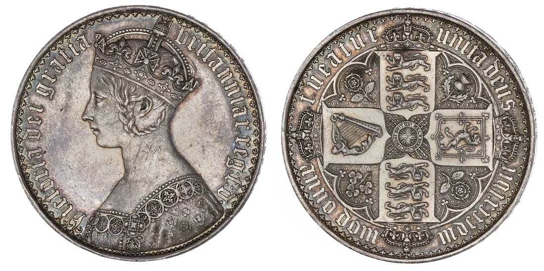 Great Britain. Victoria (1837-1901). Crown, 1847. Undecimo. Gothic bust left, rev. Crowned cruciform Arms, emblems in angles. S.3883, KM 744. Scratch on neck. Impaired Proof. Toned. Extremely Fine.