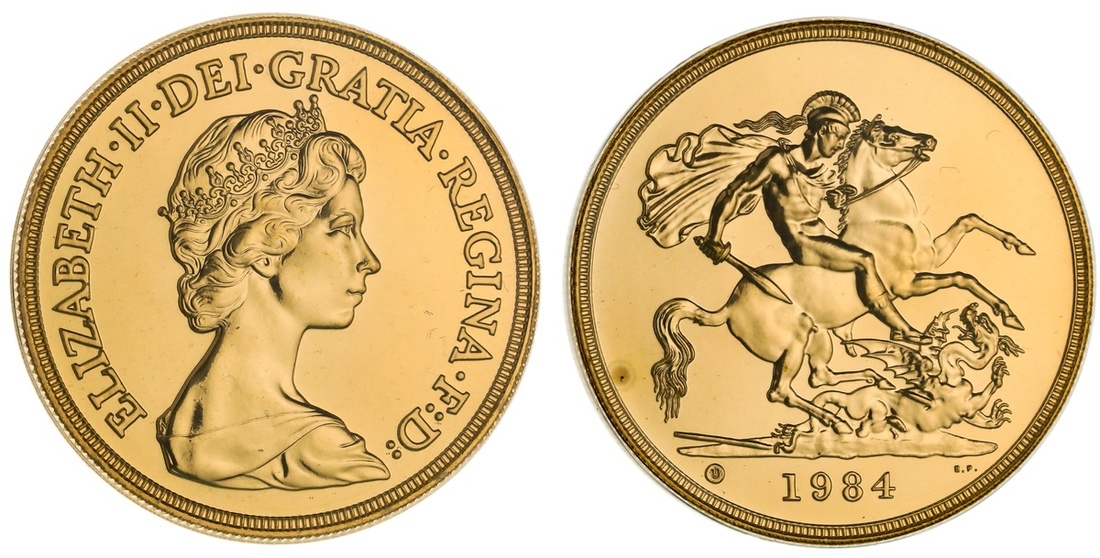 Great Britain. Elizabeth II (1952-). 5 Pounds, 1984. Crowned bust of Elizabeth II by Machin right, rev. St. George. KM 924. 25,000 pieces struck. In original RM card. Choice Brilliant Uncirculated.