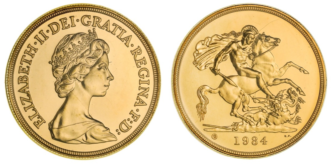 Great Britain. Elizabeth II (1952-). 5 Pounds, 1984. Crowned bust of Elizabeth II by Machin right, rev. St. George. KM 924. 25,000 pieces struck. In original RM card. Choice Brilliant Uncirculated.