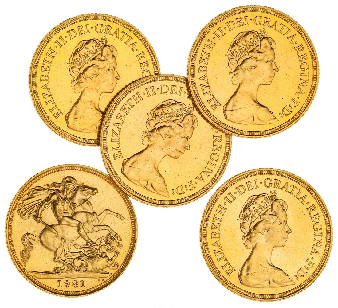 Great Britain. Elizabeth II (1952-). A Quintet of 1981 Sovereigns. Crowned bust right by Machin, rev. St. George. S.4204. Brilliant Uncirculated. (5)