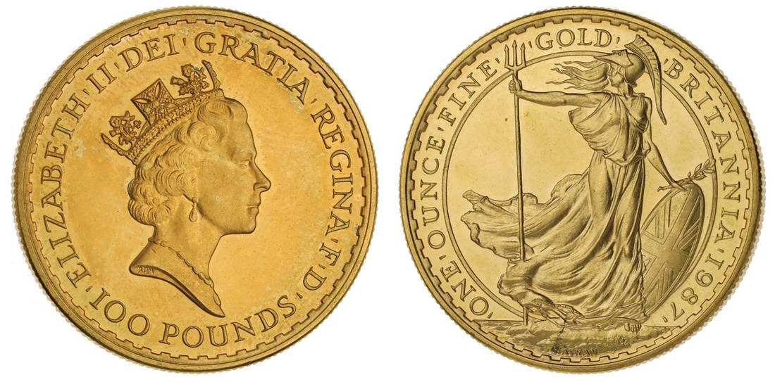 Great Britain. Elizabeth II (1952-). 100 Pounds-Britannia, 1987. Crowned bust right, rev. Britannia standing facing, head left. KM 953. Brilliant Uncirculated.
