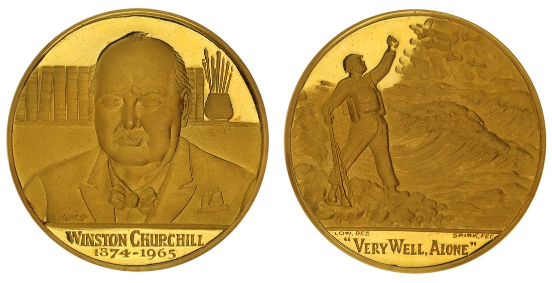 Great Britain. Elizabeth II. On the Death of the Rt. Hon. Sir Winston Churchill, 1965. Medal. Gold (22K), 38.3mm. 47.48 gms. By F. Kovacs, struck by Spink & Son, Ltd. Bust facing slightly left, books and paint brushes on a shelf behind, rev. Soldier standing defiantly on a seashore, aircraft above; "VERY WELL, ALONE" in ex. (from a cartoon by David Low). Numbered "790" and hallmarked on edge. Eimer 2104b. 1,000 pieces struck. In original Spink case. Brilliant Prooflike Uncirculated.