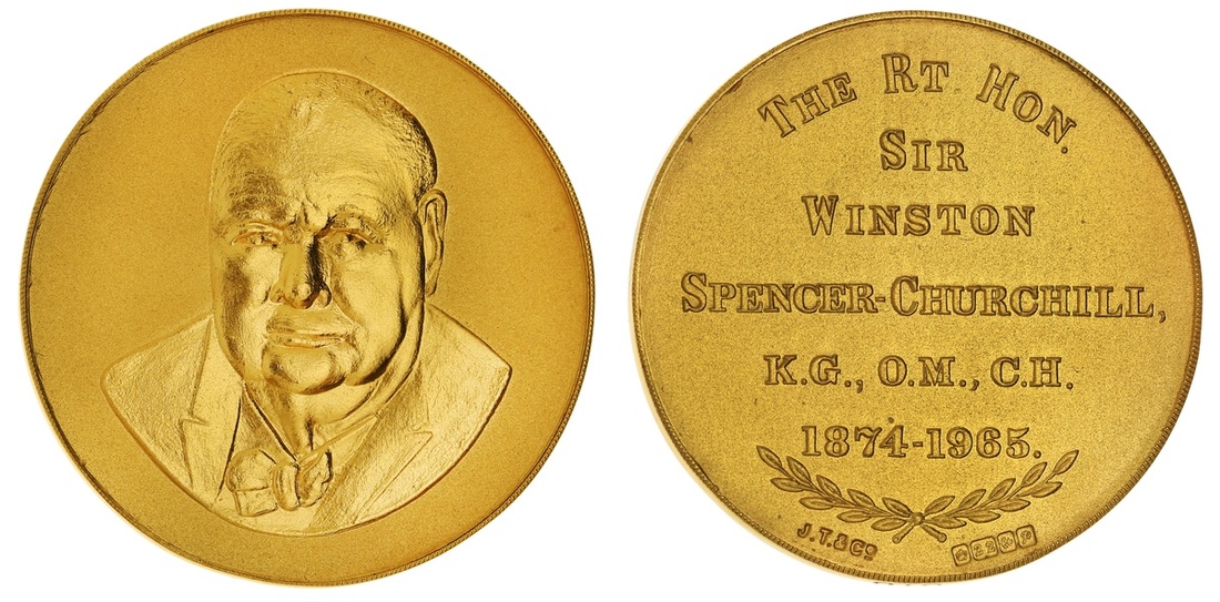 Great Britain. Elizabeth II. On the Death of the Rt. Hon. Sir Winston Churchill, 1965. Medal. Gold (22K), 39mm. 39.16 gms. Struck by John Taylor & Co., Ltd. Bust facing slightly left, rev. Five-line legend with vital dates and spray below, hallmarked near edge. In fitted case. Choice Brilliant Uncirculated.
