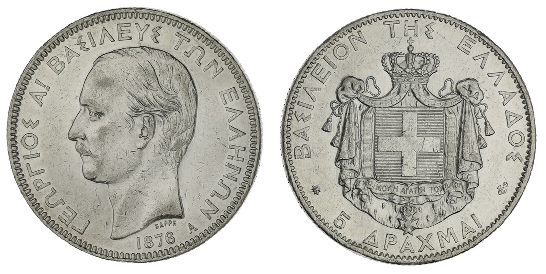 Greece. George I (1863-1913). 5 Drachmai, 1876 A. Paris. Bare head left, rev. Crowned and mantled Arms. KM 46. Once cleaned. EF-AU.