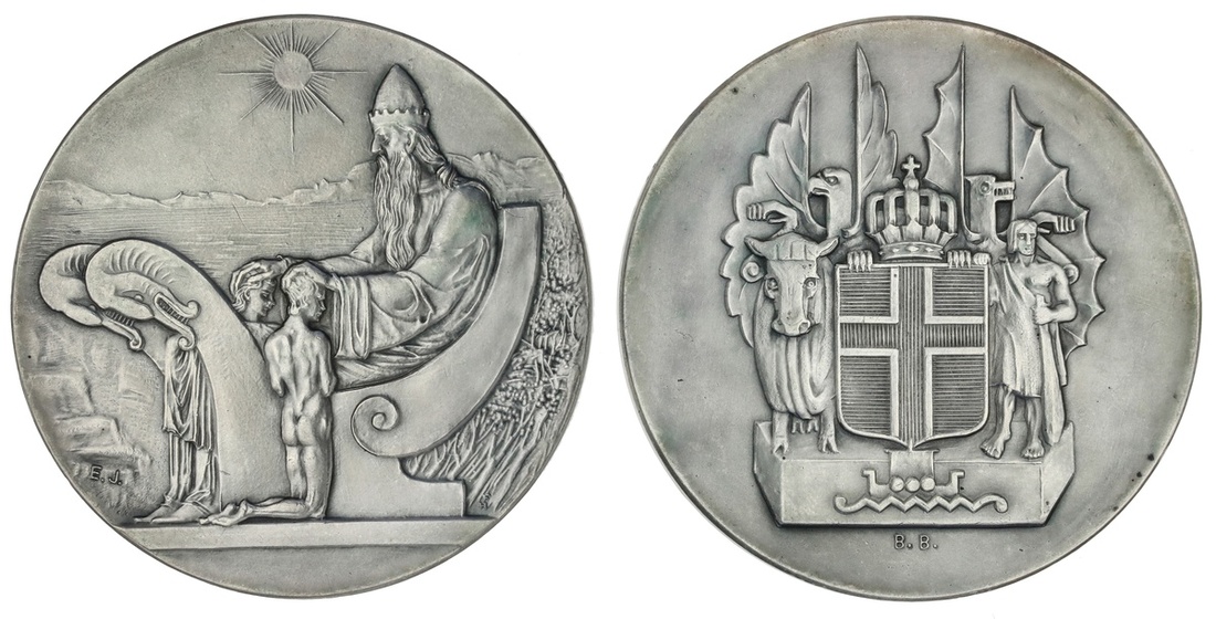 Iceland. Medallic 10 Krónur, 1930 FH. Saxon State Mint, Muldenhutten. 1000 Years of the Althing. Odin seated blessing two children. Designed by Einar Jonsson and Baldvin Bjornsson. X# M3. Choice Uncirculated.