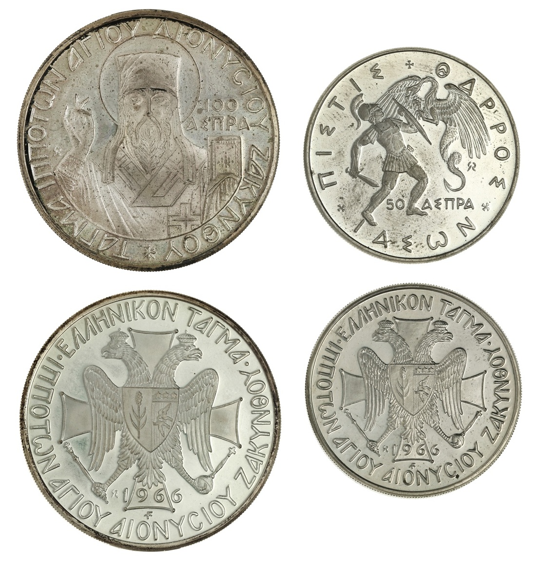 Ionian Islands. Zante. Sovereign Order of St. Dennis of Zante. Fantasy issues - 50 and 100 Aspra, 1966. Knight fighting small dragon; St. Dennis facing. X#1, 2. Brilliant Proof. (2)
