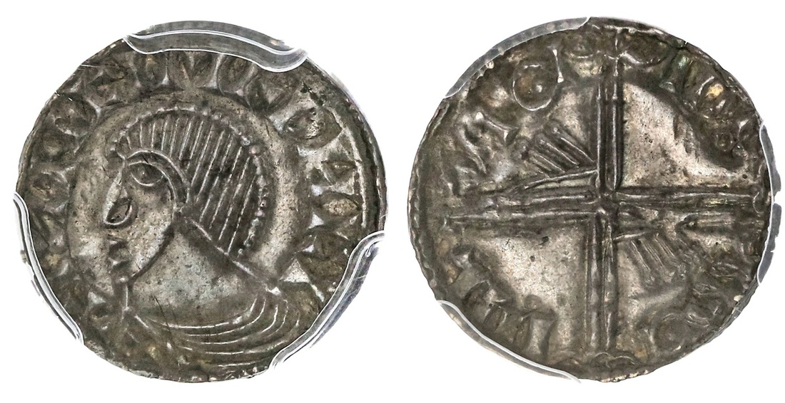 Ireland. Hiberno-Norse. Phase III. Long Cross and Hand Coinage, ca. 1035-1060. Penny. 13.5 grains. Draped, spike-haired bust left, hair formed of spiked lines ending in pellets in rounded uniform coif, blundered legends, rev. Voided long cross, each limb ending in triple crescent, hand of four lines in two angles. S.6132. PCGS MS 63.