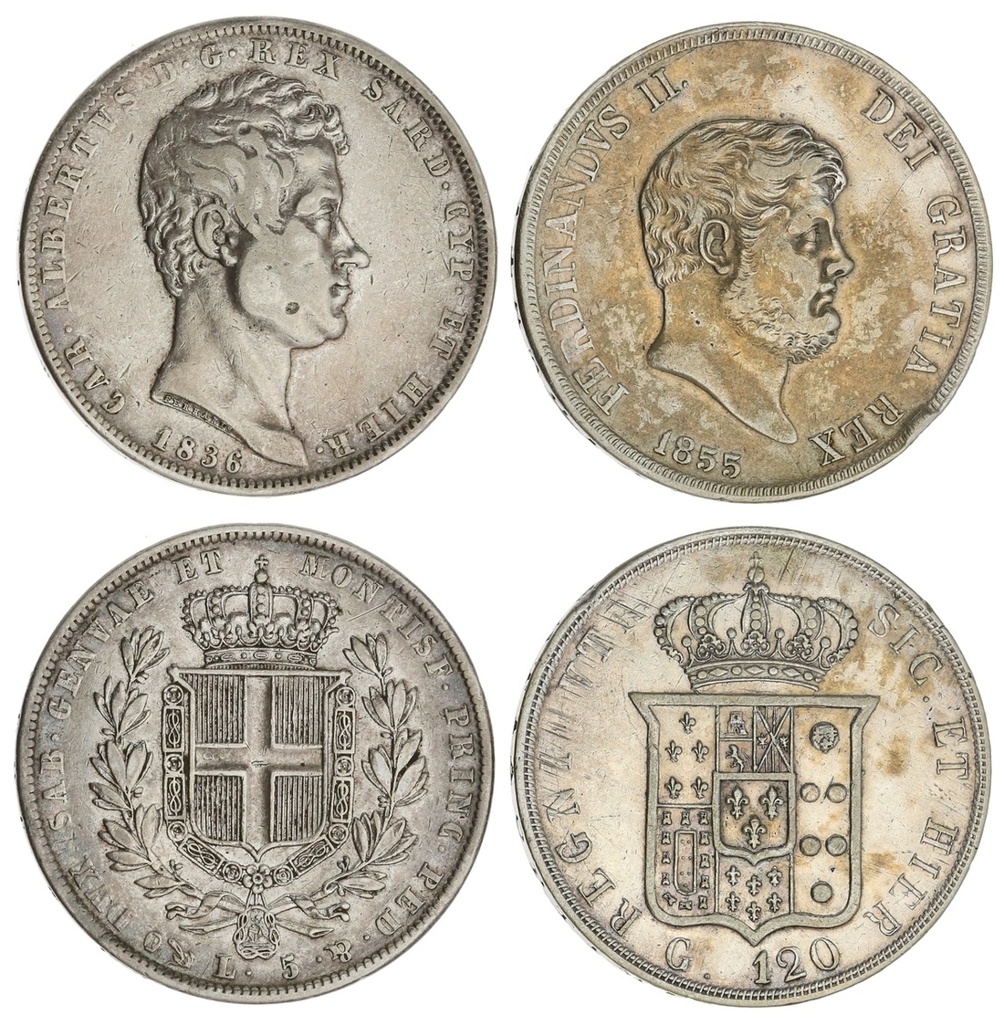 Italian States. Pair of Crowns -- Naples and Sicily. Ferdinando II (1830-1859). 120 Grana, 1855. Bare head right. KM 370. Light reverse adjustment marks. Small rim tap. About EF; Sardinia. Carlo Alberto (1831-1849). 5 Lire, 1836 P. Head right. KM 130. Dimple on cheek. Good Very Fine. (2)