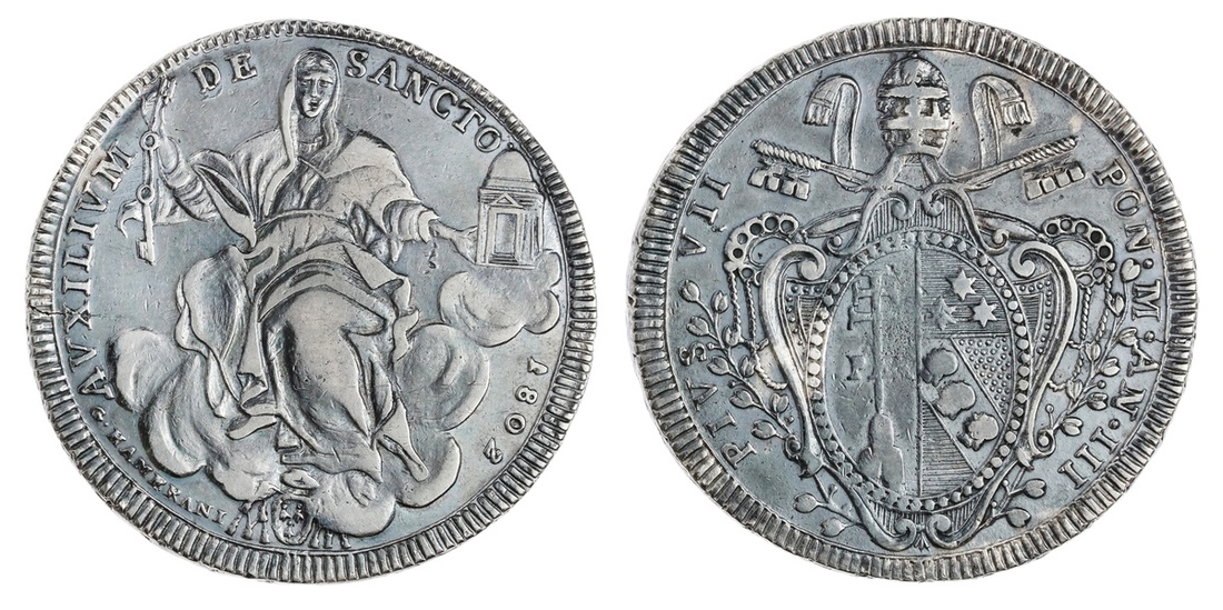 Papal States. Pius VII (1800-1823). Scudo, 1802 Anno III. Roma. Papal Arms, rev. The Church personified by Hamerani seated in the clouds. KM 1249. Tiny dig below Church's hand. Good Very Fine.