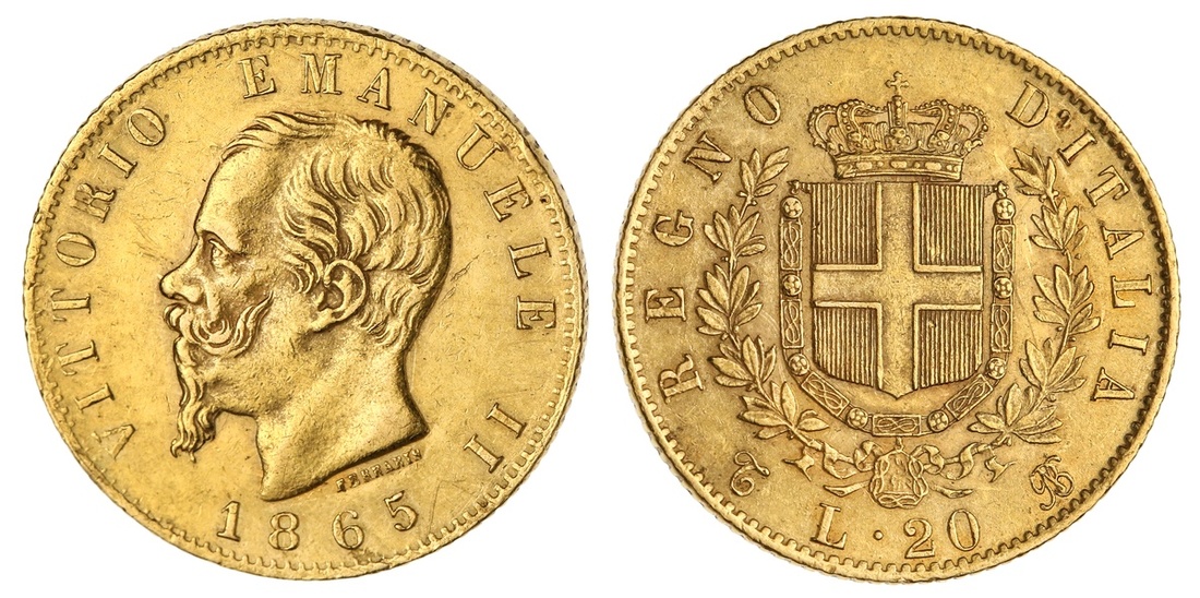 Italy. Kingdom. Vittorio Emanuele II (1861-1878). 20 Lire, 1865 T BN. Torino. Bare head left, rev. Crowned Arms within open wreath. KM 10.1. Some tiny edge tics. Extremely Fine.