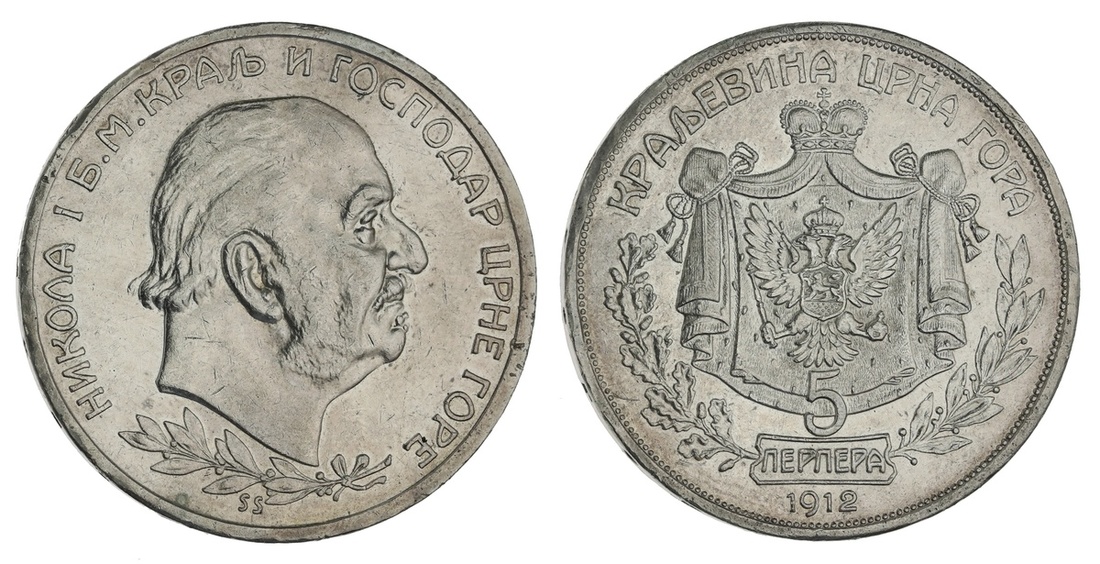 Montenegro. Nicholas I, as King (1910-1918). 5 Perpera, 1912. Bare head right, spray below, rev. Crowned and mantled Arms, spray below. KM 15. A few light bagmarks. About Uncirculated.
