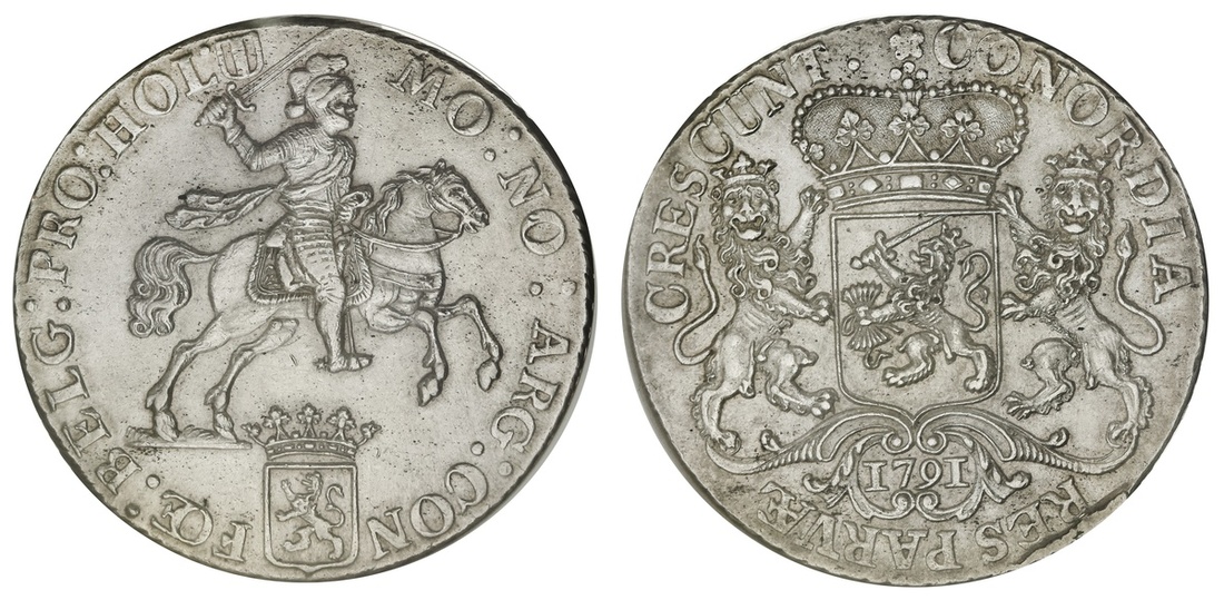 Netherlands. Holland. Ducaton, 1791. Armored knight riding right, small crowned shield below, rev. Crowned Arms supported by lions, date on cartouche below. Dav.1827, KM 90. NGC Unc Details - Obv Graffiti (left field).