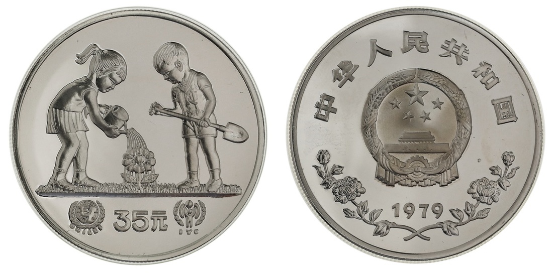 China. People's Republic. Proof 35 Yuan, 1979. UNICEF and IYC. Children planting and nurturing a flower. KM 8. 14,000 pieces struck. Choice Brilliant Proof.
