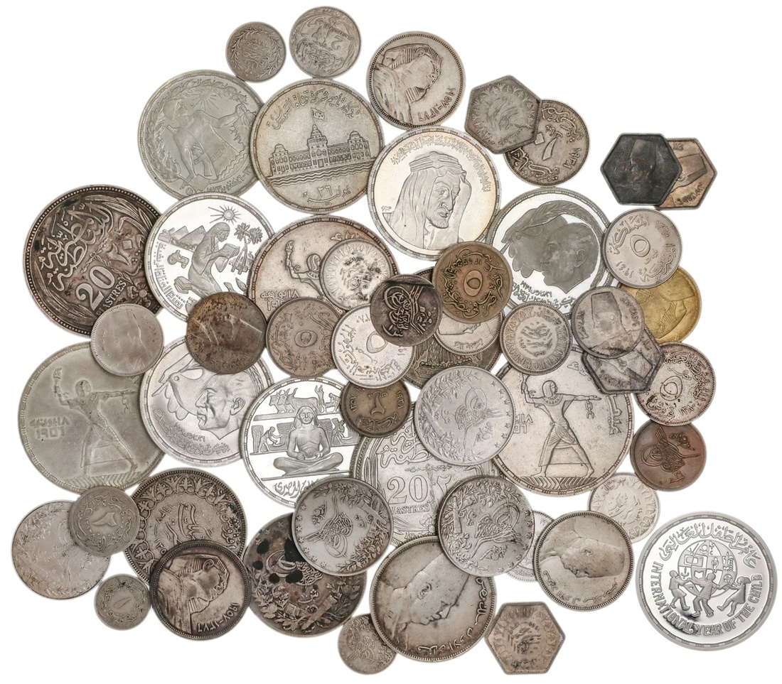 Egypt. Ottoman-Arab Republic. Assortment of Crowns and Minors. Ottoman: 10 'Irsh, 5 'Irsh (4), 'Irsh (3), copper-nickel and AE (4); British Protectorate: 20 'Irsh (2), 2 'Irsh; Malik Fuad. 10 'Irsh, 5 'Irsh, copper-nickel (2); Malik Farouk: 10 'Irsh, 2 'Irsh (11), copper-nickel (3); About Fine-VF; First Republic: Evacuation of the British 50 'Irsh (3), Nationalization 25 'Irsh, AH 1375-1956, 10 'Irsh (2), AE; UAR. 20 'Irsh, 5 'Irsh (3); and Arab Republic: Commemorative Gi'neh (Pounds) - AH 1394/1974 October War, AH 1396/1976 Malik Faisal, AH 1399/1979 Land Reform (Proof) AH 1400-1980 Egyptian-Israeli Peace (2, Proof and BU), AH 1400/1980 FAO (Proof), and Proof 5 Gineha AH 1401/1981 IYC. VF-Brilliant Proof. (52).