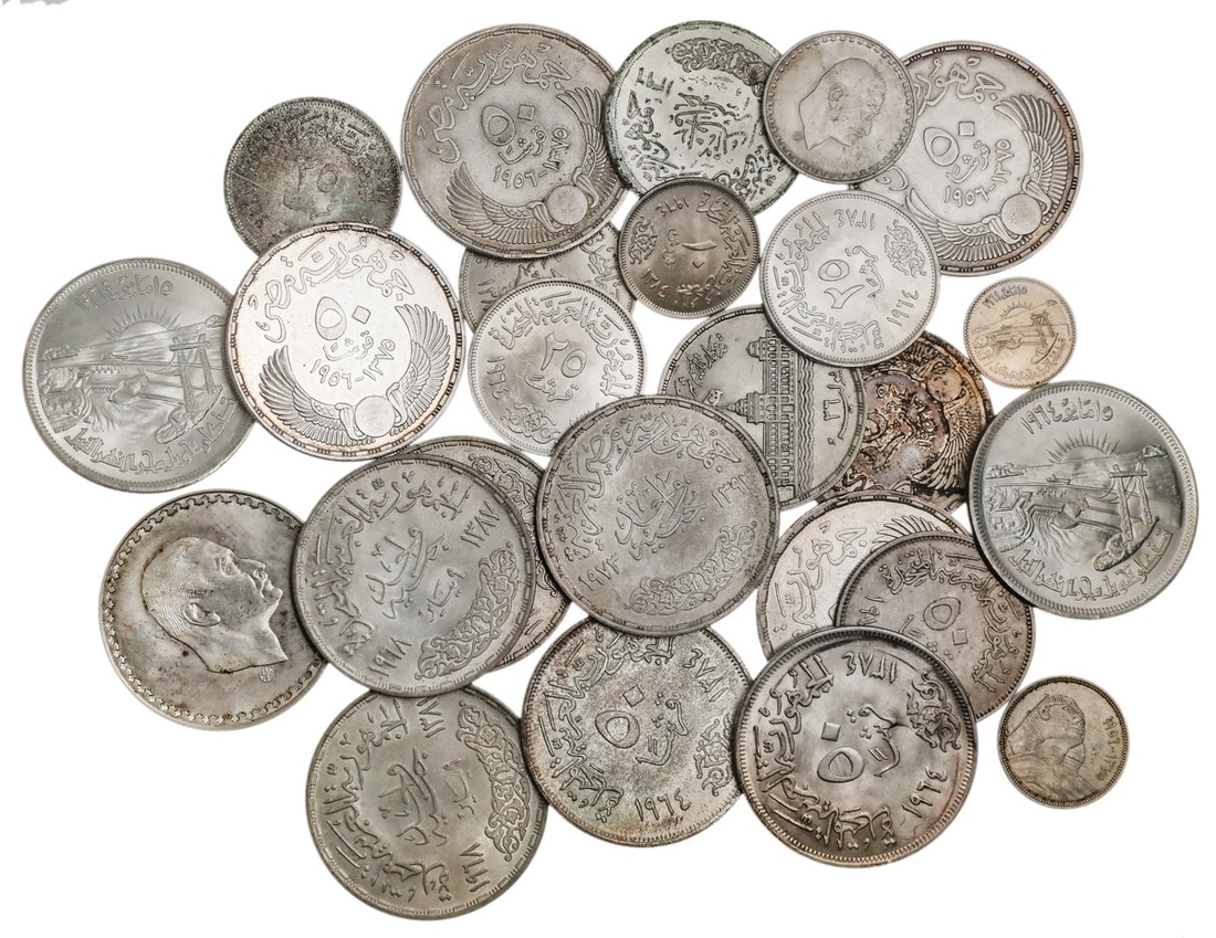 Egypt. Array of Silver Crowns, Halfcrowns and Minors: First Republic. 50 'irsh, AH 1375-1956 - Evacuation of the British (4); 25 'Irsh, AH 1375-1956 - Suez Canal Nationalization (2); and 5 'Irsh. VF-AU; United Arab Republic. Diversion of the Nile, AH 1384-1964 -- 50 'Irsh (4), 25 'Irsh (4), 10 'Irsh, and 5 'Irsh; Aswan Dam Power Station, AH 1387-1968 (4); Gamal `Abd-el Nasser, AH 1390-1970 - Gi'neh (Pound), 50 and 25 'Irsh; also Arab Republic. Gi'neh (Pound) AH 1396-1976 - Reopening of the Suez Canal. About Uncirculated-Brilliant Uncirculated. (25)