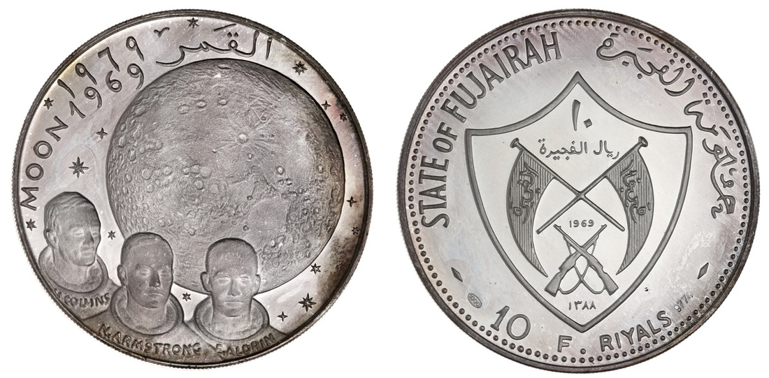 Fujairah. Muhammad b. Hamad al-Sharqi (1952-1974). 10 Riyals, AH 1388 - 1969. Apollo XI. Astronauts busts, moon and stars behind, number 9774 at right. KM 4.1. Toned. Brilliant Proof.