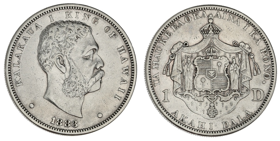 Hawaii. Kalakaua I (1874-1891). Dollar, 1883. Bare head right, rev. Crowned and supported Arms, AKAHI DALA. Cleaned. Very Fine.