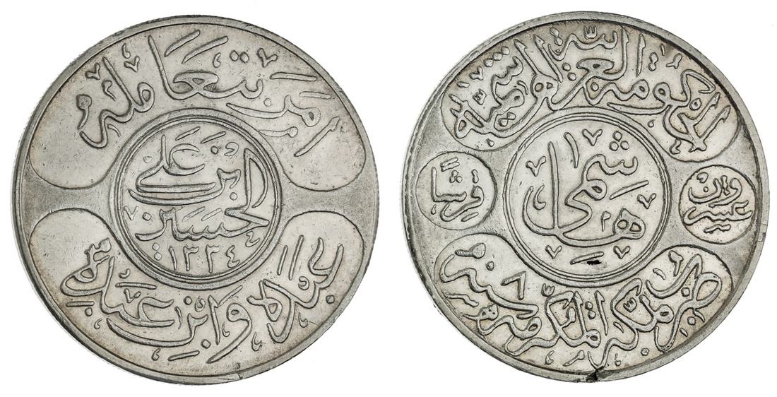 Hejaz. Al-Husain b. `Ali (AH 1334-1342/1916-1924). 20 Qurush (Riyal), AH 1334, year 8. Ruler's name with accession date in central circle, two curved cartouches with legend, rev. Hashimi in central circle, value in two small circles at sides, two curved cartouches with legend. KM 30. Small edge flaw from strike. About Uncirculated.