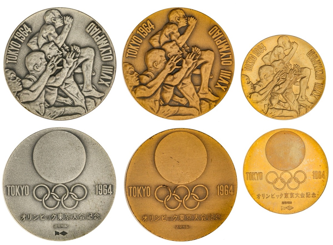 Japan. 1964 Tokyo Olympics Medals Set. Gold (18k), 22.3mm, 7.24 gms; Silver and Bronze, 30mm. By Yusaku Kamekura. Issued by the Tokyo Olympic Fund Raising Association. Line of runners sprinting right, revs. Tokyo 1964 and Olympics emblem. The silver and bronze with matte-antique finish. Brilliant Uncirculated.