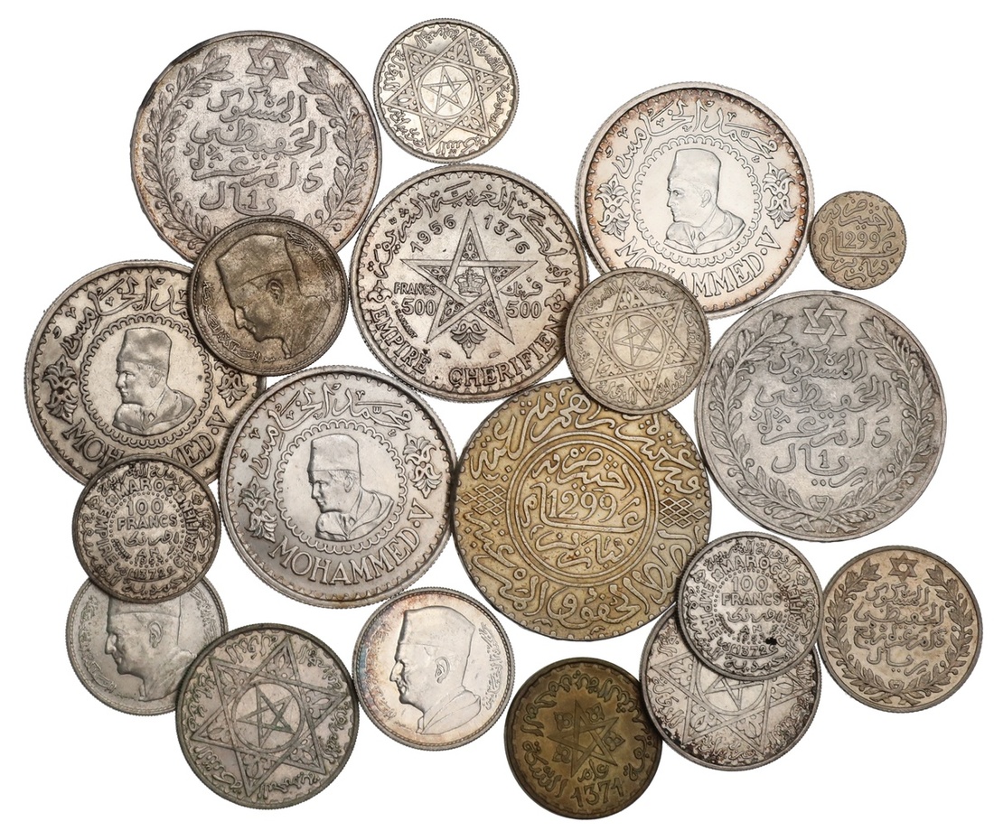 Morocco. Lot of silver issues. Moulay al-Hasan I (AH 1290-1311/1873-1894 AD). 10 Dirham, AH 1299. Solder marks, and ½ Dirham, AH 1299; `Abd al-Hafiz (AH 1326-1330/1908-1912 AD). ¼ Rial, Rials (2), AH 1329. VF-EF; Muhammad V (AH 1346-1381/1927-1962 AD). 100 Francs (4), 200 Francs (2), 500 Francs (4), Dirham (3). VF-Unc.; also base metal minor. (19)