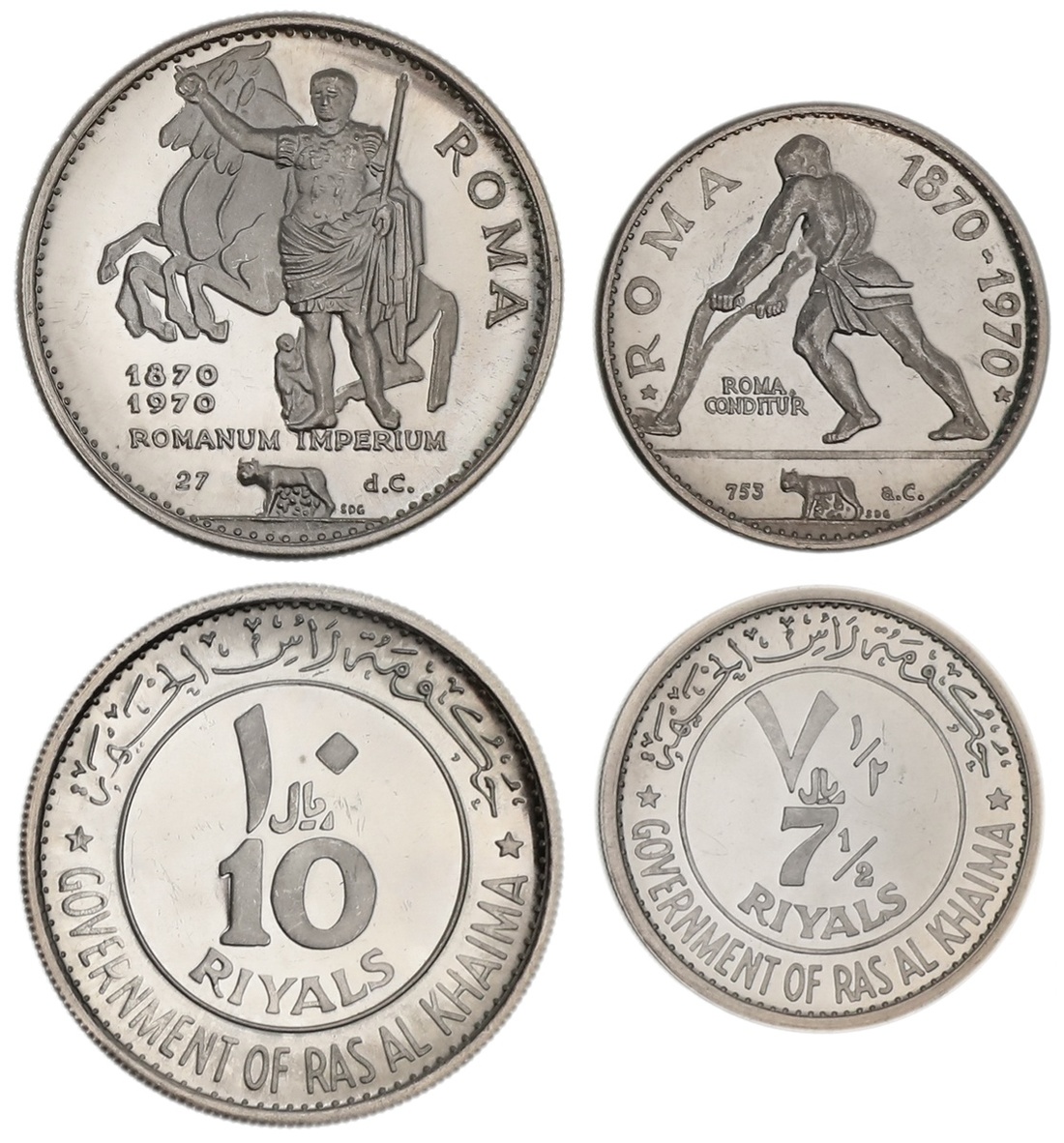 Ras al-Khaimah. Saqr b. Muhammad al-Qasimi (1948-2010). Pair. Proof 10 and 7 ½ Riyals, 1970. Centennial of the Liberation of Rome. Emperor standing saluting, rearing horse behind, Wolf and Twins below; Man plowing field. KM 17, 18. About 2,000 pieces struck of each. Slight clouding on first, light friction marks on second. Brilliant Proof. (2)