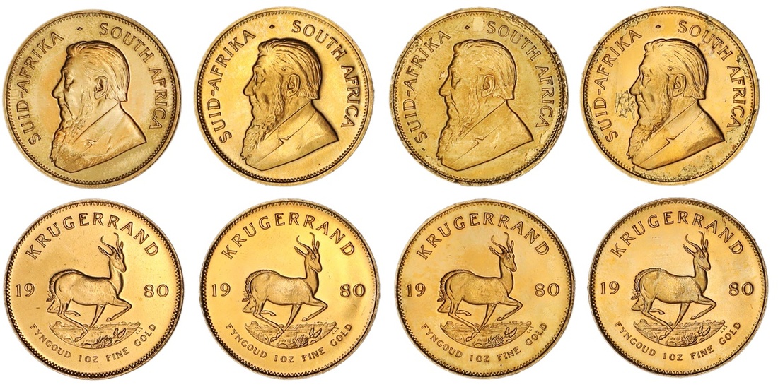 South Africa. Republic. Quartet of 1980 Krugerrands. Bust of Oom Paul - Paul Kruger left, rev. Springbok. KM 73. One with some clouding, one with bagmarks. Brilliant Uncirculated. (4)