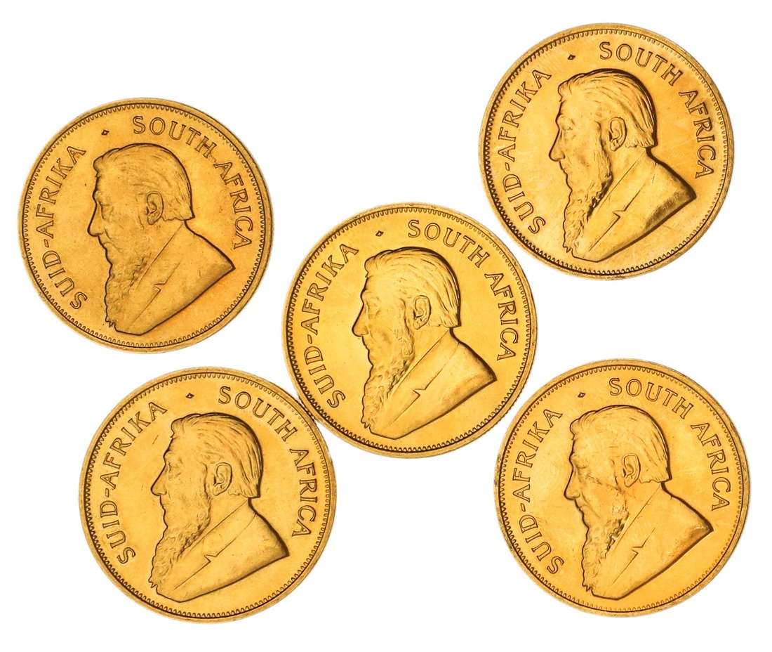 South Africa. Republic. A quintet of 1980 Krugerrands. Bust of Oom Paul - Paul Kruger left, rev. Springbok. KM 73. Brilliant Uncirculated. (5)