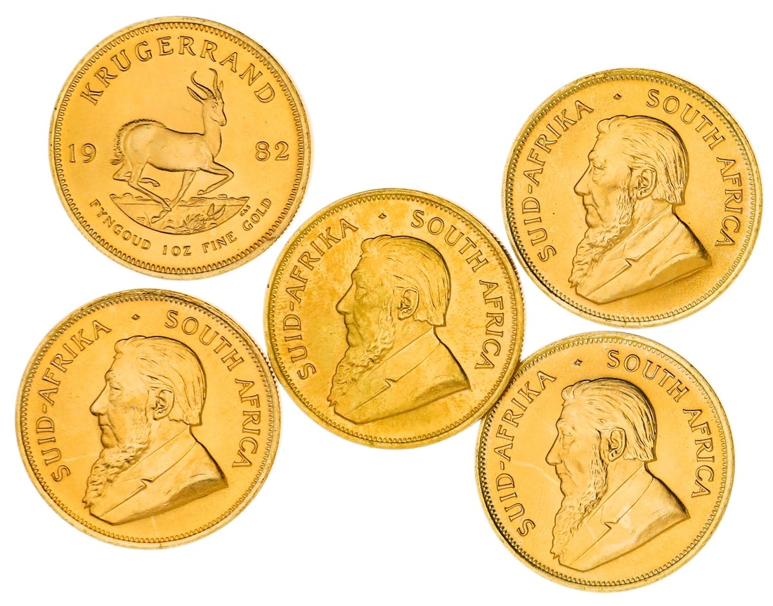 South Africa. Republic. Another Quintet of 1982 Krugerrands. Bust of Oom Paul - Paul Kruger left, rev. Springbok. KM 73. Choice Brilliant Uncirculated. (5)