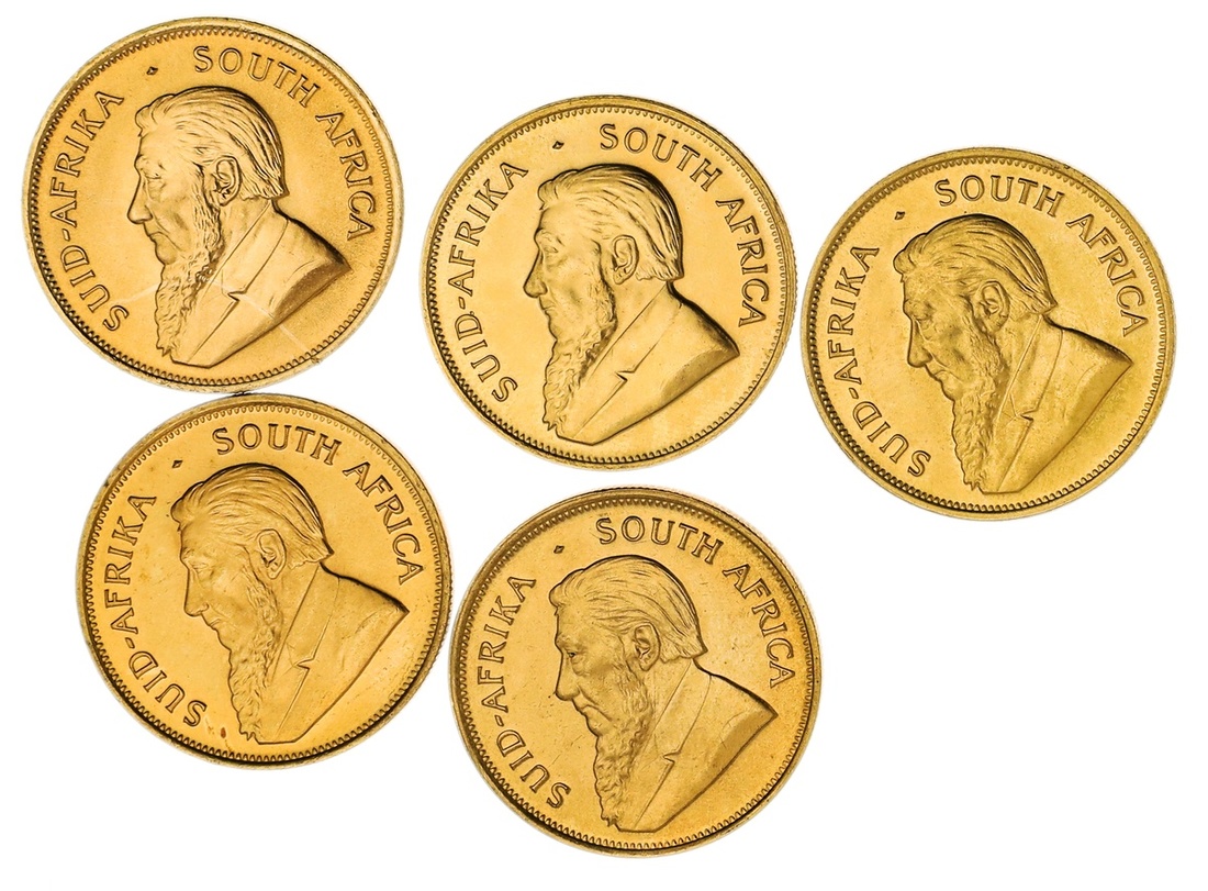South Africa. Republic. Quintet of Krugerrands - Assortment of dates: 1974, 1975, 1978, 1980, 1982. Bust of Oom Paul - Paul Kruger left, rev. Springbok. KM 73. Choice Brilliant Uncirculated. (5)