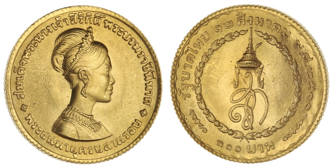 Thailand. Rama IX (1946-2016). 300 Baht, BE 2511 (1968). Queen Sirikit 36th Birthday. Her bust right, rev. Crowned monogram. Y.89. Choice Brilliant Uncirculated.