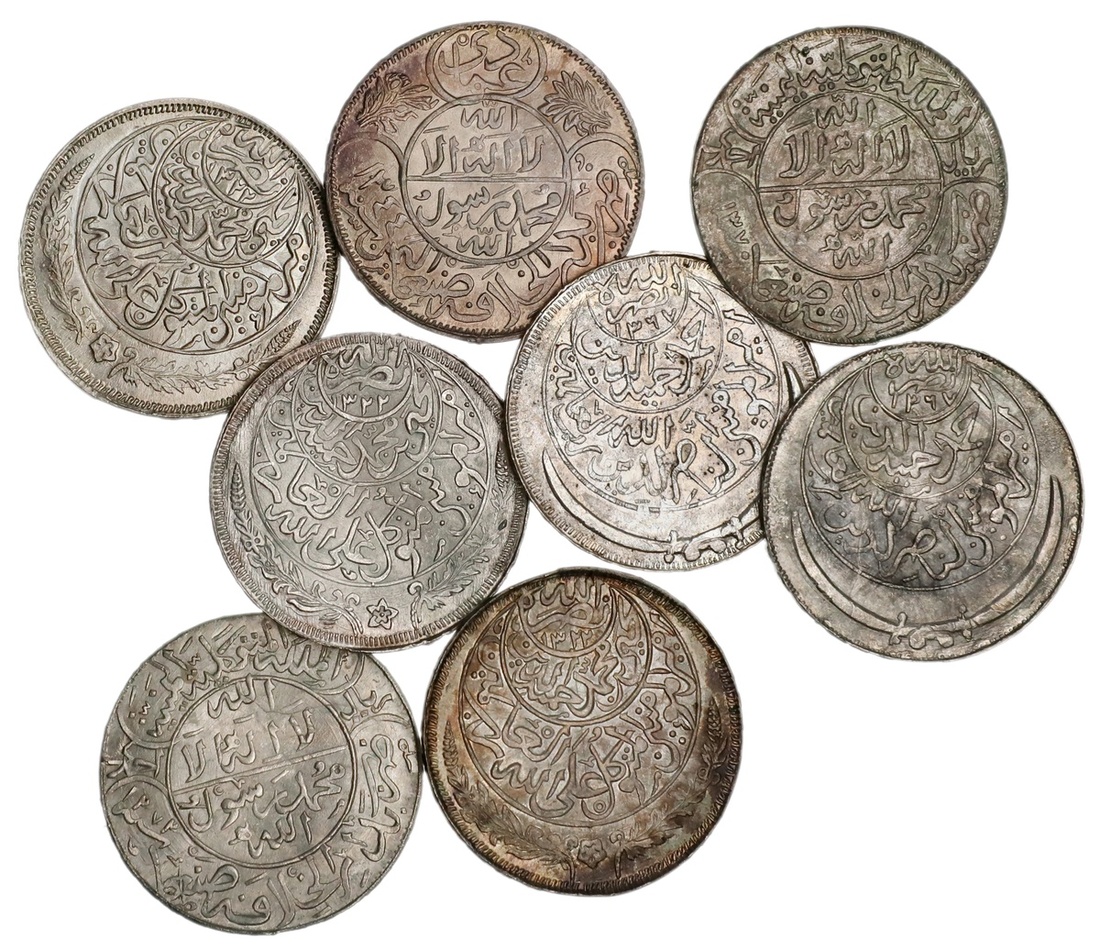 Yemen. Mutawakkilite Kingdom. al-Mutawakkil Yahya b. Muhammad - al-Nasir Ahmad b. Yahya, AH 1322-1382/1904-1962 AD. Lot of Riyals. `Imadi -- AH 1344 (4). Y.7; and Ahmadi. AH 1370, AH 1373 (3). Y.17. Toned. Extremely Fine-Uncirculated. (8)