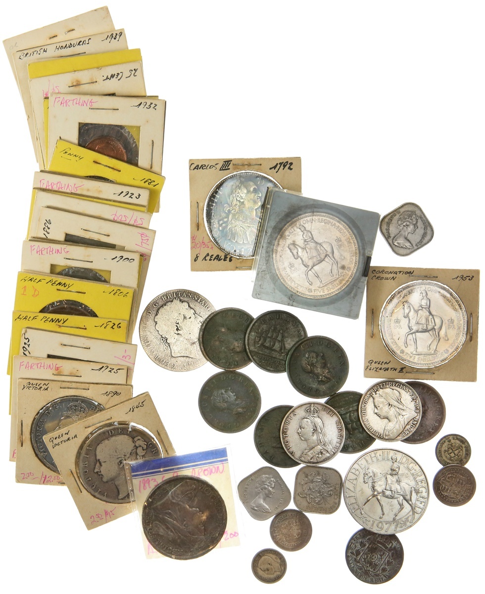 British and World Hodgepodge Great Britain. Well-worn 1819 (scratches) and 1845 Crowns, cleaned 1890 Crown, 1893 Crown. Toned AU, but graffiti "K" on reverse; Victorian Florins (2) and 1826 Shilling. VG-Fine; AEs (14), 19th-20th Century, 1953 Coronation Crowns (3); Bahamas 1806 Pennies (7). About VG-Fine (some with scratches or other surface issues), Mexican 1792 8 Reales. Some surface porosity, VF and World minors. (45)