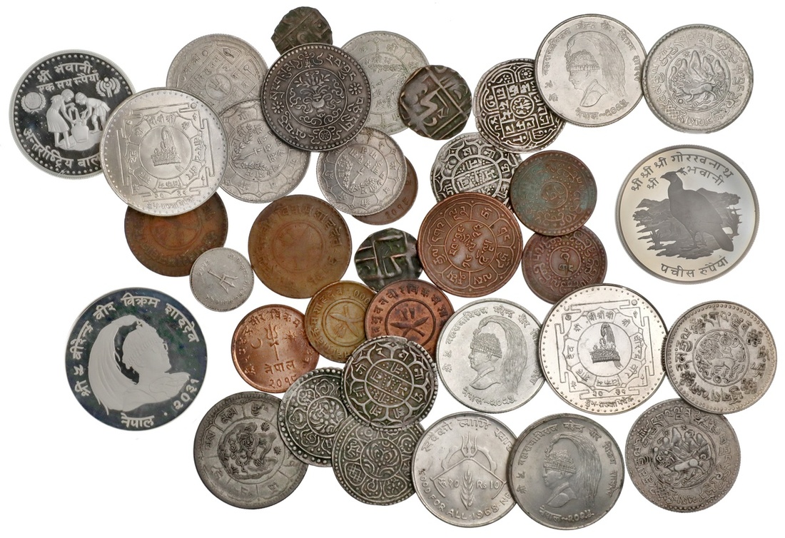 Himalayan Lot. Includes. Tibet. 3 Srang (4), Billon 10 Srang, Tangka (2), AE 5 Sho, 16-23 and Shos (2), VF-EF; Nepal. 1968 FAO 10 Rupees (4), Coronation 25 Rupee 1974 (2), Proof 25 and 50 Rupee, 1974 Conservation, Proof IYC 100 Rupees 1974, Rupees (3), ½ Rupee, 20 Paisa, Silver Mohars (3), AEs (7); and Bhutan. AE Debs (3) Fine-BU. (37)