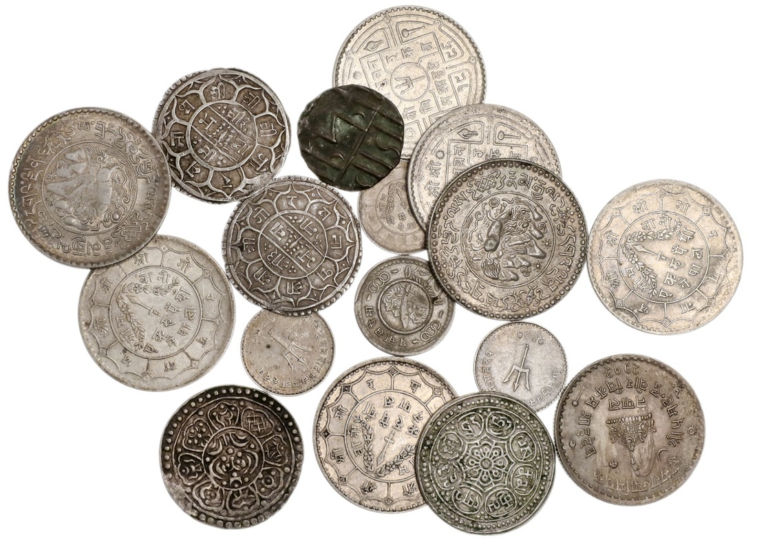 Smaller grouping of Himalayan coinage. Includes: Tibet. 3 Srang (2), Tangka (2); Nepal. Silver Mohars (2), silver Rupees (5), minors (5); and Bhutanese Deb. VF-AU. (17)
