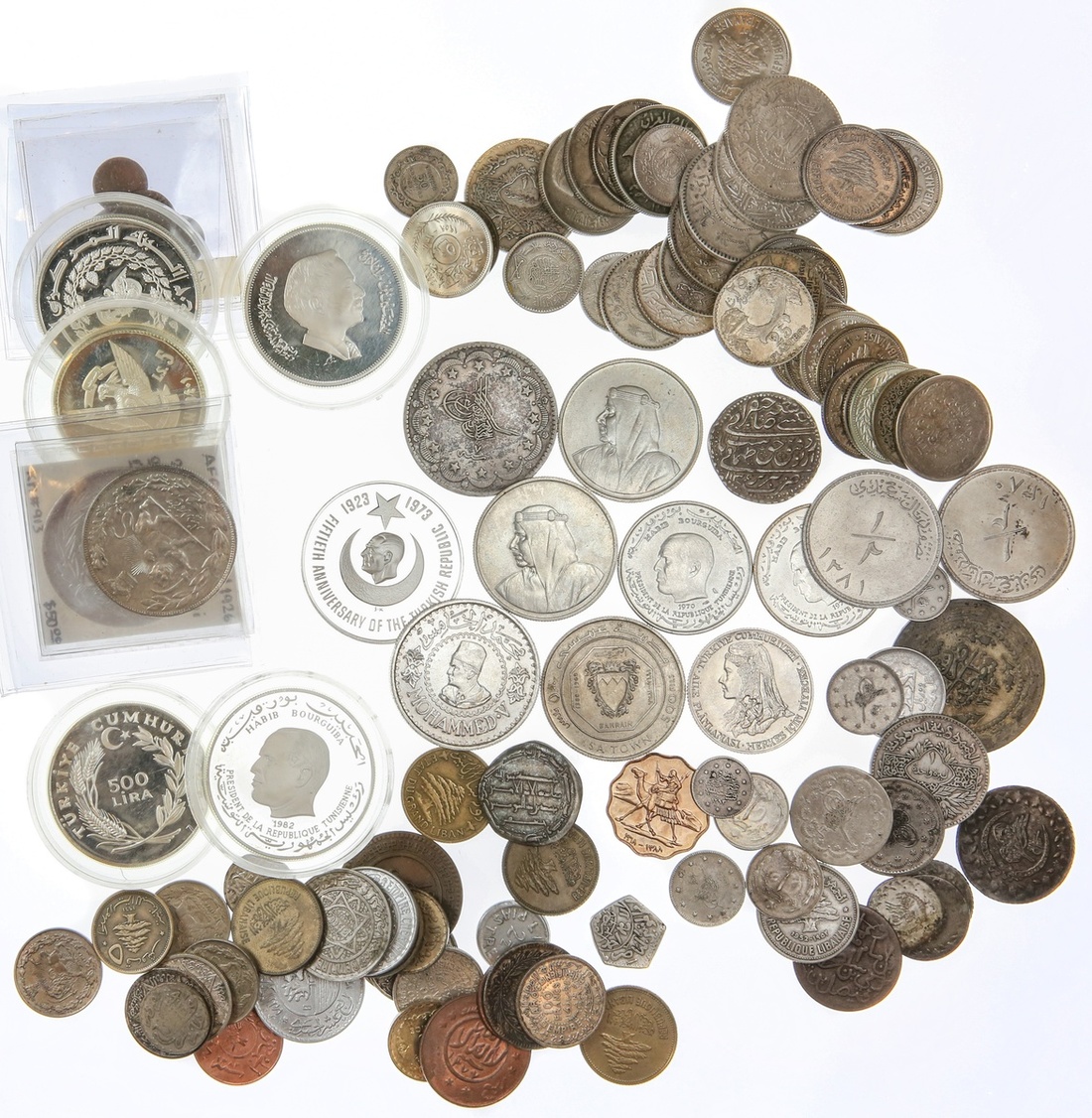 Diverse Lot of Middle Eastern, North African, Turkish and other coins. Includes: Bahrain. Isa Town 500 Fils (3); Fujairah. Proof 2 Riyals, 1970 - Nixon; Morocco - 500 Francs, 1956; silver minors (7), AEs (5); Tunisia. Proof 5 Dinars, 1982. IYC, FAO Dinars, 1970 (2), silver minor; Muscat & Oman. ½ Saidi Riyals, AH 1380, 1381; Yemen. Proof 25 Riyals, 1983. IYC; 1/8 Ahmadi Riyal, base metal (5); Saudi Arabia. Riyals (4), ½ Riyals (4), ¼ Riyals (3); Sudan. Proof 5 Pounds, 1981. IYC; Jordan. Proof 3 Dinars, 1981. IYC; Lebanon. 1952 50 Piastres (16), 25 Piastres, 1929 (2); Turkey. Ottoman. 20 Kurush, silver minors (8), billon (5); Republic. Proof 500 Lira, 1979 IYC, 150 Lira, 1979; medal and silver minor; Iran. 5 Kran, SH 1307, silver minors (3), Nowruz tokens (2); Afghanistan. 2 ½ Afghani, SH 1306, Rupee; Bukharan silver and AE (3) minors; silver minors from Syria (5), Iraq (6), various AEs (12); also Hammered Islamic Silver - Abbasid, Ilkhan, and Safavid. Fine-BU. (117)