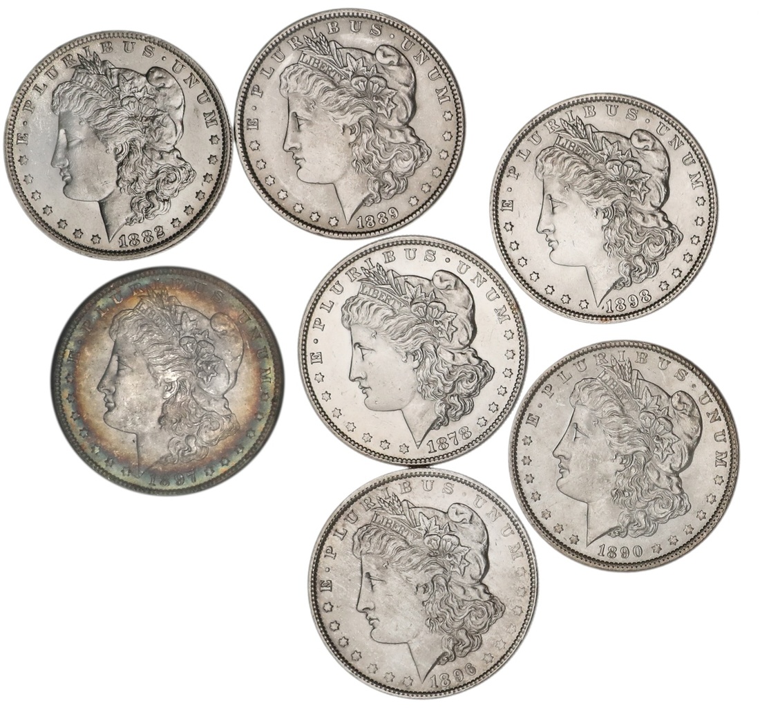 Septet of Morgan Dollars 1878-S, 1882-O, 1889, 1890, 1896, 1897 (ex Redfield Collection), 1898. AU-BU. (7)
