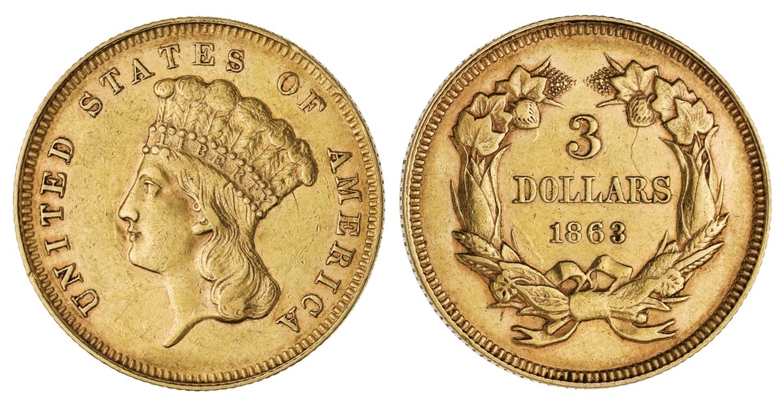 1863 $3 Gold. Extremely Fine. Minor friction marks.