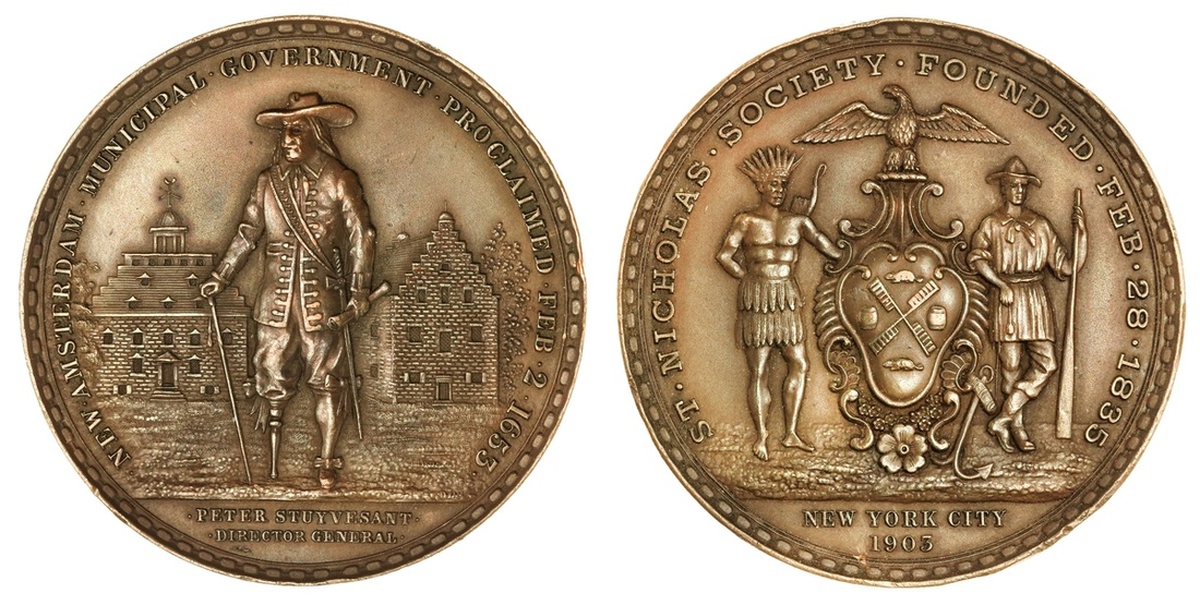 St. Nicholas Society. New York City, 1903. 250th Anniversary of New Amsterdam's Proclamation of Municipal Government. Medal. Bronze, 50mm. Peter Stuyvesant standing ¾ left before building façade, rev. Supported Arms of the City of New York. A few minor rim nicks. Extremely Fine.