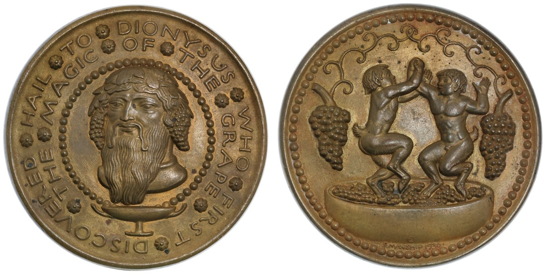 Dionysus. Society of Medalists. Second Issue, 1930. Bronze, 72.5mm. By Paul Manship. Bust of Dionysus facing ¾ left; Hail to Dionysus Who First Discovered The Magic Of The Grape, rev. Two satyrs foot pressing grapes, flanked by bunches of grapes. A popular medal. Choice Extremely Fine.