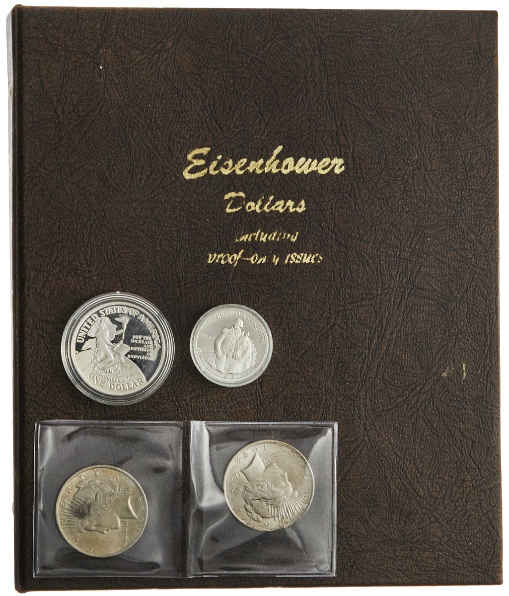 U.S. Oddments. Includes: Unc 1922 and 1924 Peace Dollars, Ike Dollars - 40% Silver (12), clad (7), BU-Proof, in Dansco album; Proof 1996 Smithsonian Dollar; Proof 1982 Washington Half Dollar; Civil War Tokens (2), Transportation Tokens (2) and a BU 1955 Cent.