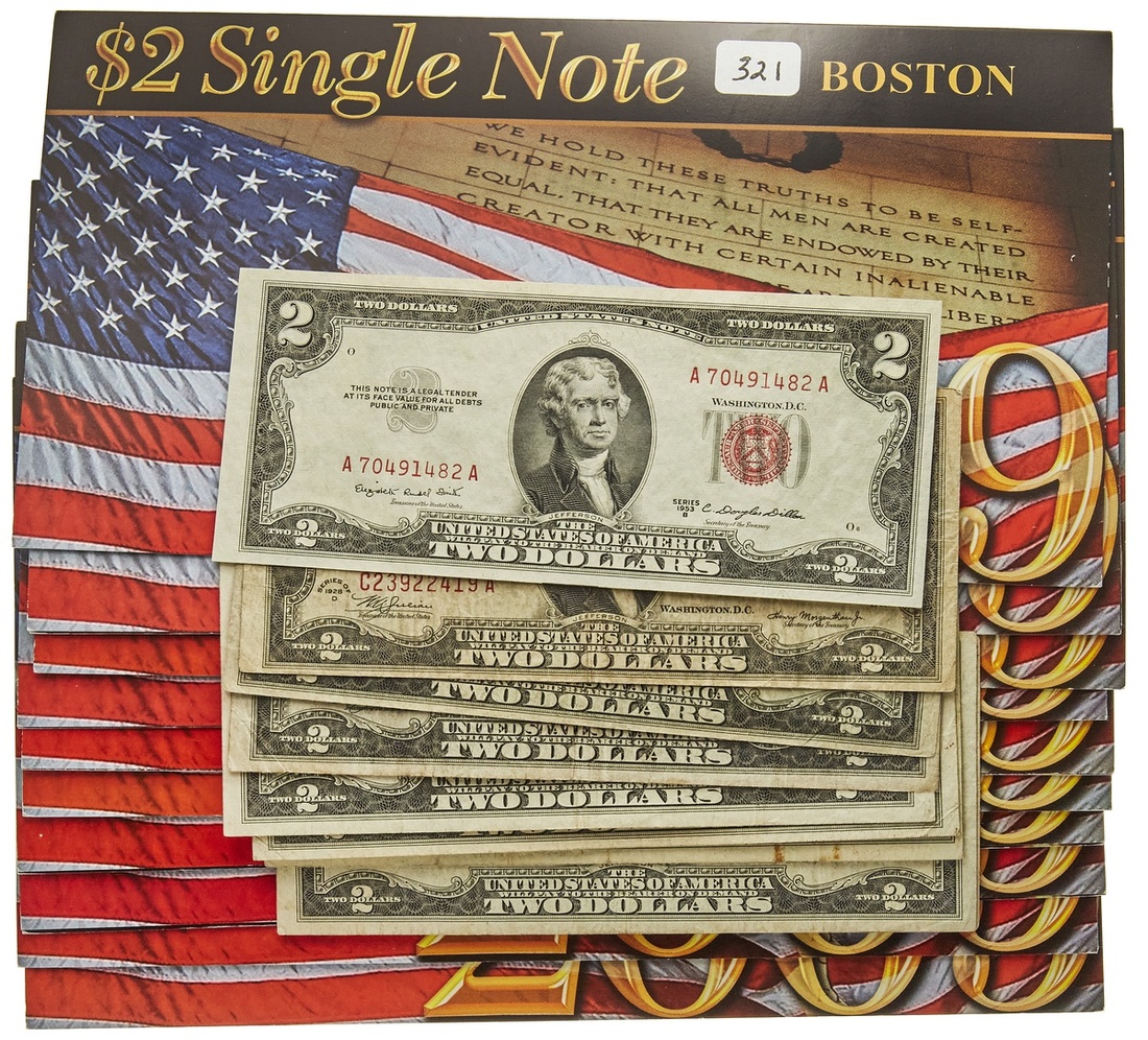 Two Dollar Bill Lot. Legal Tender: 1928 D (3), 1928 G (2). One with penciled number. VG-F+; 1953 (2), 1963. One with penciled number, Fine; 1953 B. AU but bar spindleholes at left; Federal Reserve Notes: 2003 A. Boston, NY, Philadelphia, Cleveland, Richmond, Atlanta, Chicago, St. Louis, Dallas and San Francisco. In individual BEP folders. CU. [19]