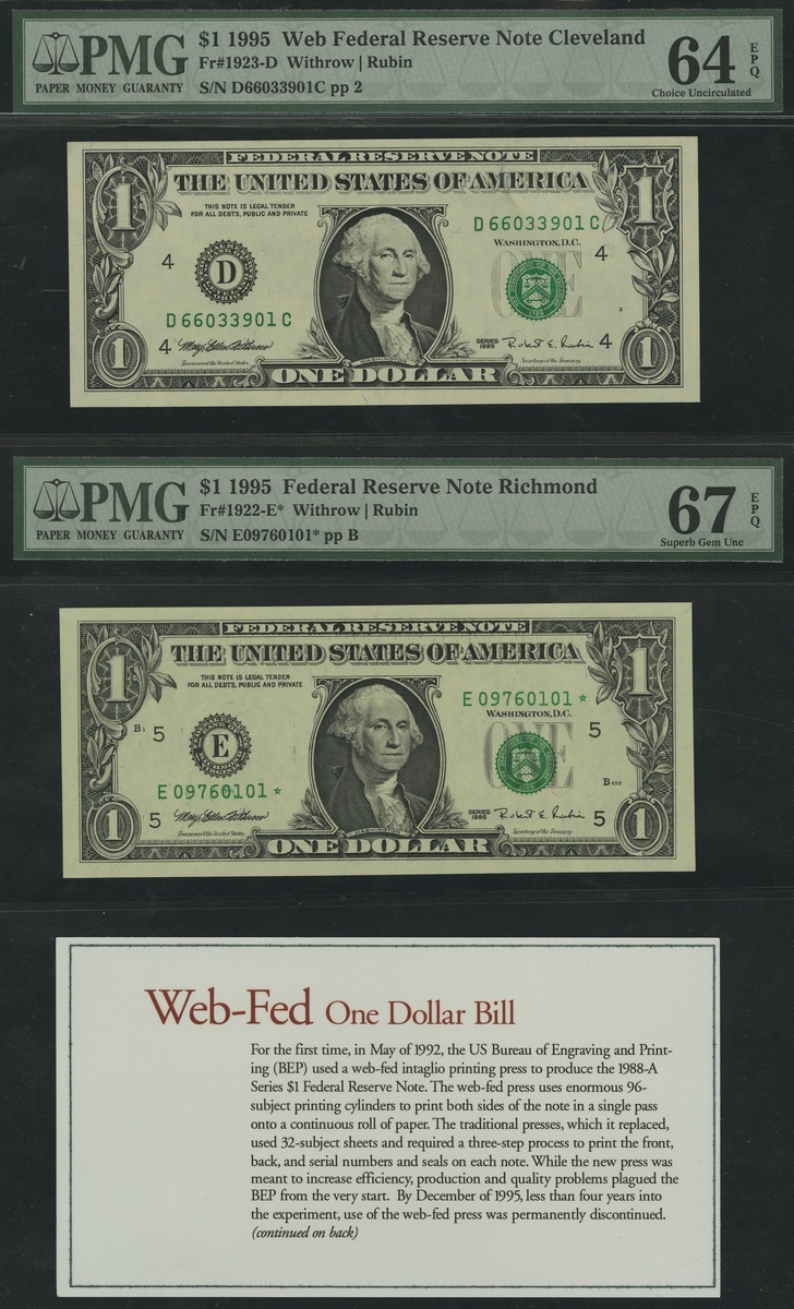 Web-Fed $1 Display Group. Fr.1923-D. 1995 Web-fed Dollar PMG Choice Uncirculated 64 EPQ; with non-web-fed Dolalr of that year. Fr.1921-E*. PMG Superb Gem Unc 67 EPQ (wrong Fr. # on holder), with "Web-Fed" info card sealed in sheet.