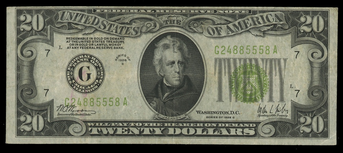 Fr.2053-G. $20 Federal Reserve Note. Chicago 1928 C. Woods-Mills. Very Fine.
